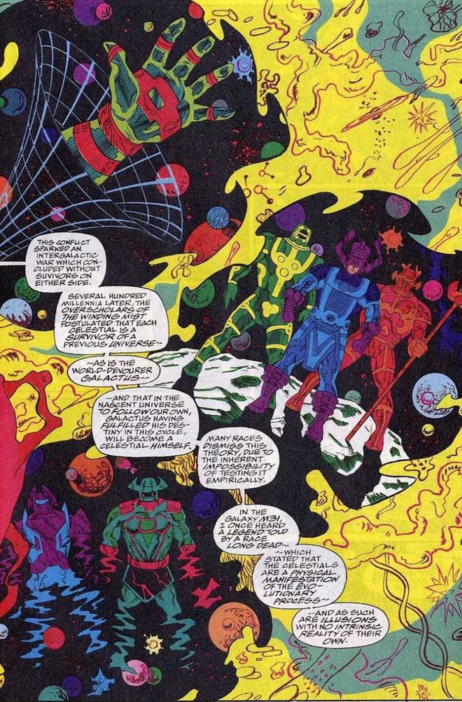Os Celestiais são entidades antigas, oriundas do Primeiro Cosmo, responsáveis por criar estrelas, planetas e até manipular a genética de raças inteiras, como os Eternos e os Deviantes. Galactus, por sua vez, surgiu do fim do universo anterior ao atual, sendo o último sobrevivente daquela realidade. Mas as semelhanças entre as duas entidades são inegáveis.