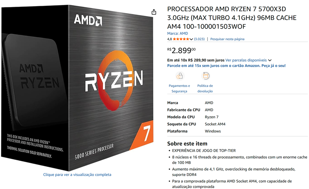 Até julho, ainda era possível encontrar o Ryzen 7 5700X3D nos principais varejistas brasileiros para componentes de PC; mas esse não é mais o caso. Ainda encontramos o processador à venda na Amazon, mas custando R$ 2.899, chegando a R$ 3.599 no Mercado Livre.