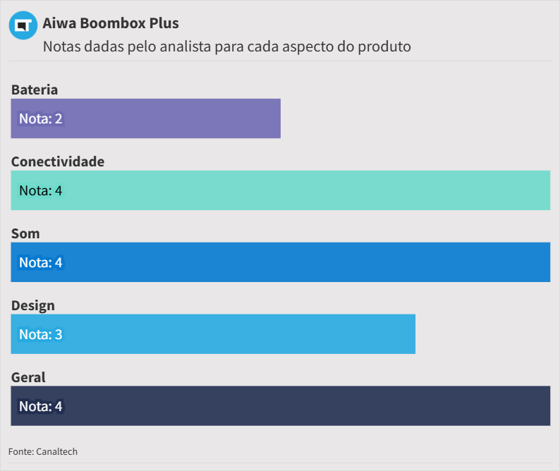 O desempenho sonoro impressiona pelo volume e pelo impacto dos graves, embora seja mais voltado para quem gosta de um som encorpado e festivo do que para quem busca equilíbrio absoluto. A autonomia de bateria é baixa, não se destacando frente a alguns concorrentes que conseguem entregar mais horas de reprodução.