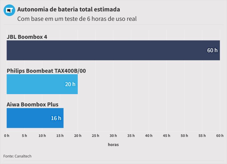 Esse número fica abaixo até mesmo da Philips Boombeat, que já traz uma autonomia fraca para a categoria. Em nosso teste padronizado de seis horas, o modelo usou pouco mais de 40% da sua carga em volume médio, reforçando que ela não aguenta passar longos períodos longe da tomada.